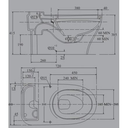 • Kích thước bồn cầu: 720 x 400 x 520mm;