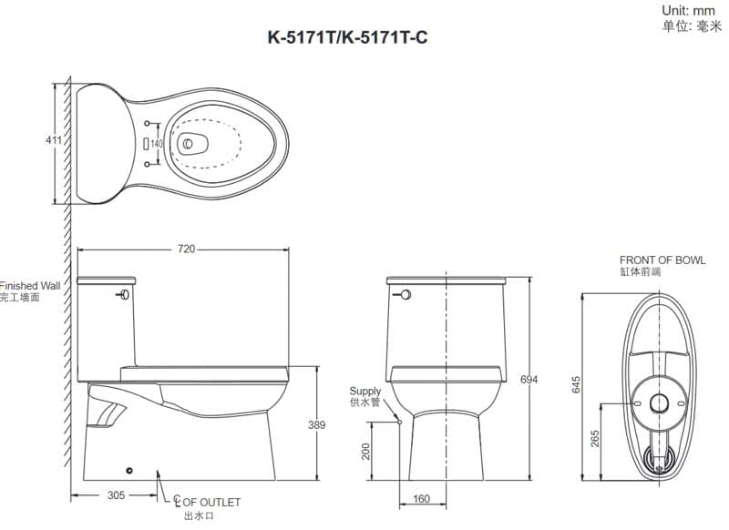 Hình ảnh: bản vẽ kỹ thuật Bồn cầu một khối KOHLER K-5171T-CM-0