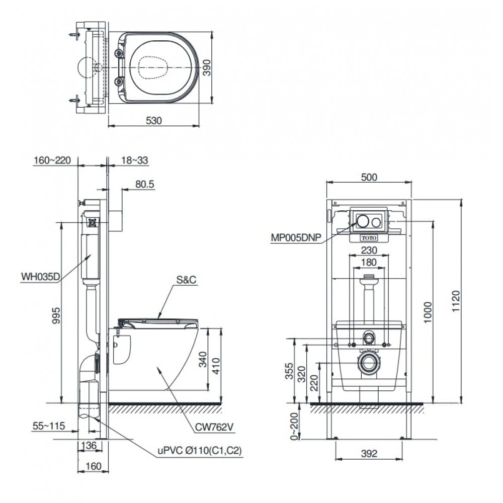 Hình ản: bản vẽ kỹ thuật Bồn Cầu TOTO CW762/WH035D/MB005DCP Treo Tường