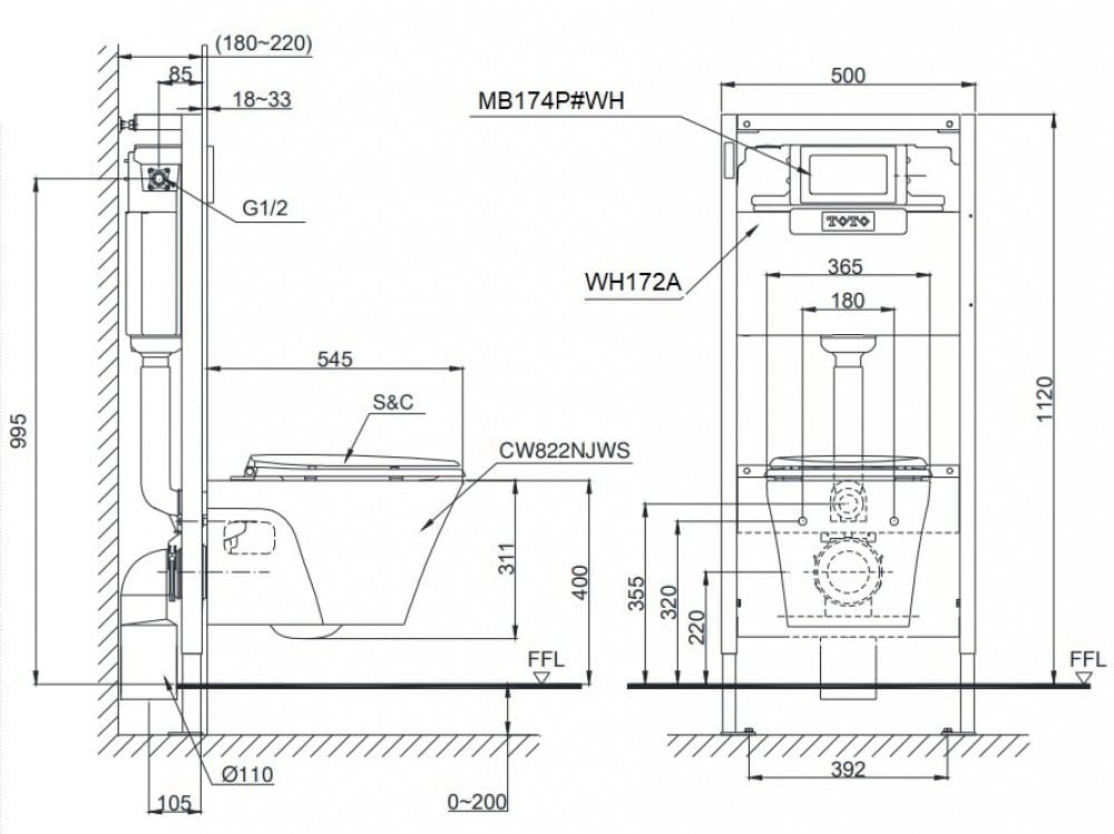 Hình ảnh: bản vẽ kỹ thuật Bồn Cầu TOTO CW822NJWS/MB174P/WH172A Treo Tường
