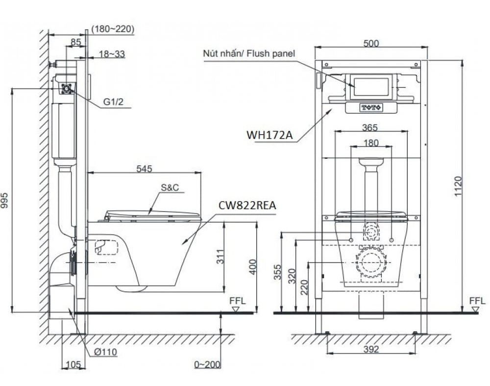 Hình ảnh: bản vẽ kỹ thuật Bồn Cầu TOTO CW822REA/TCF4911EZ/WH172A/MB174P#SS Nắp Điện Tử Treo Tường
