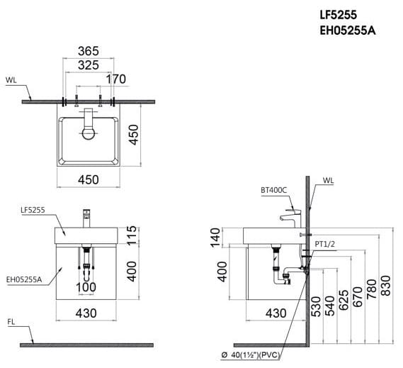 Bản vẽ kỹ thuật Chậu Rửa Mặt Đặt Bàn Caesar LF5255 két hợp với tủ chậu EH05255A: