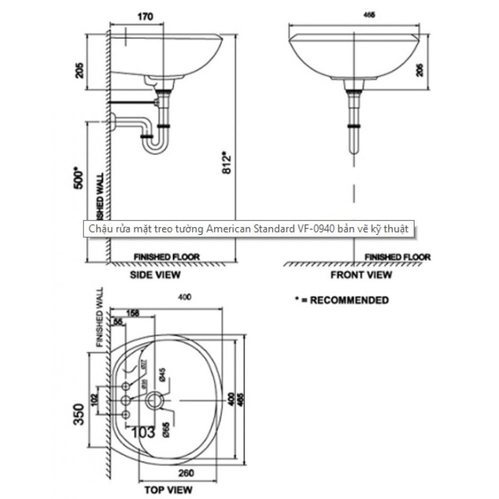 Bản vẽ kỹ thuật Chậu rửa mặt treo tường American Standard Gala VF-0940: