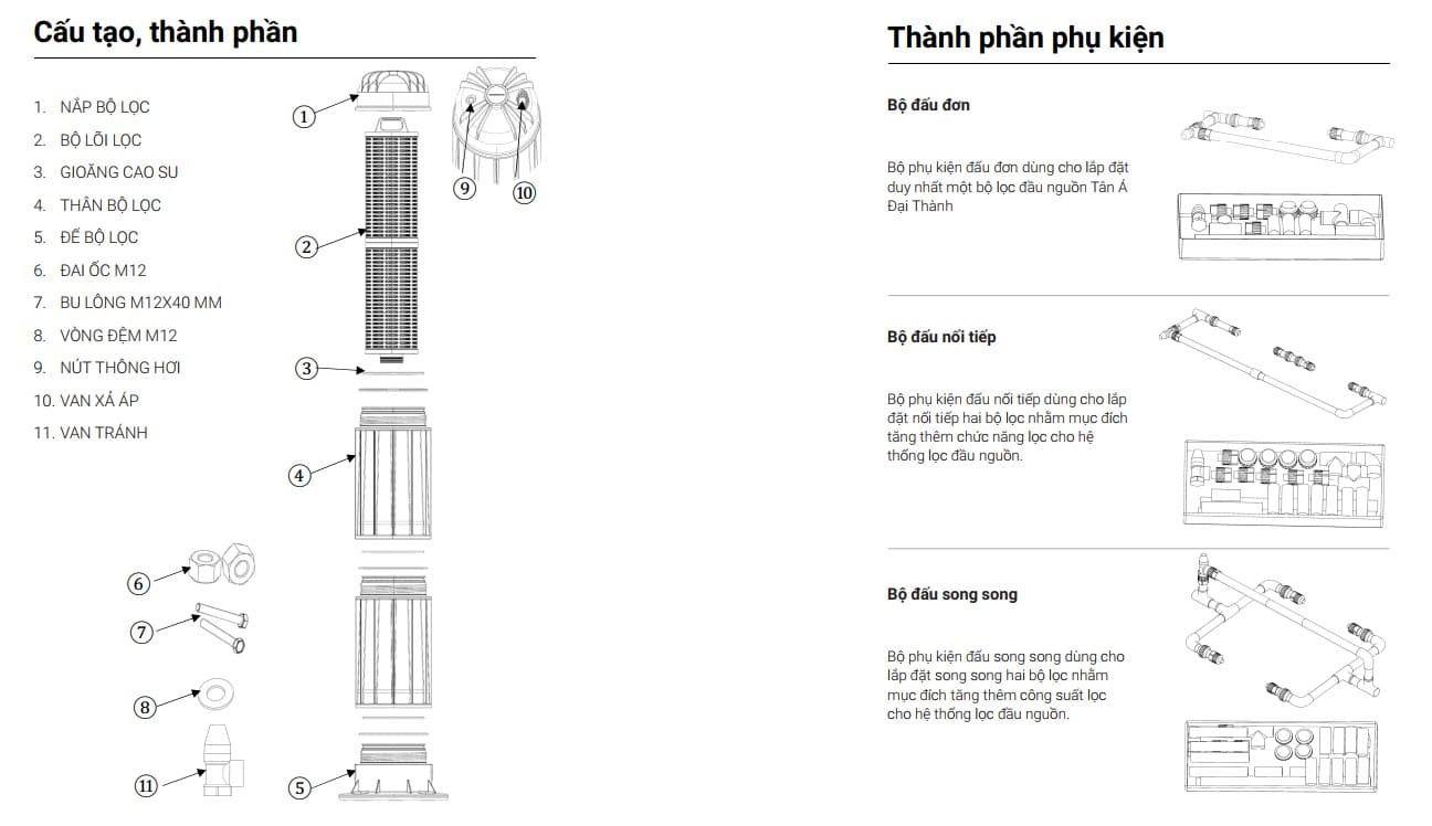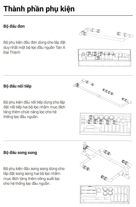 - Bộ đấu đơn: Bộ phụ kiện đấu đơn dùng cho lắp đặt duy nhất một bộ lọc đầu nguồn BELUGA Tân Á Đại Thành.