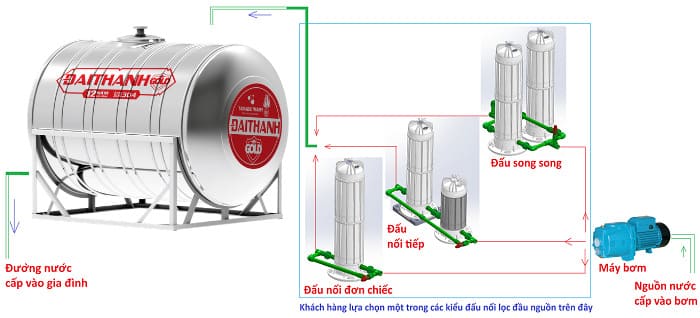 - Bộ đấu nối tiếp: Dùng để lắp đặt nối tiếp hai bộ lọc nhằm mục đích tăng thêm chức năng lọc cho hệ thống lọc đầu nguồn.