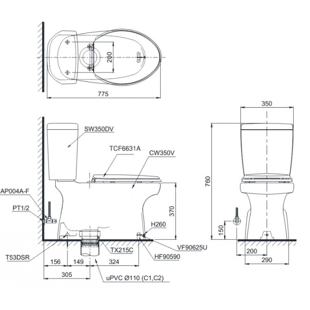 Hình ảnh: bản vẽ kỹ thuật Bồn Cầu Điện Tử TOTO CS350DW7 Nắp Rửa Washlet