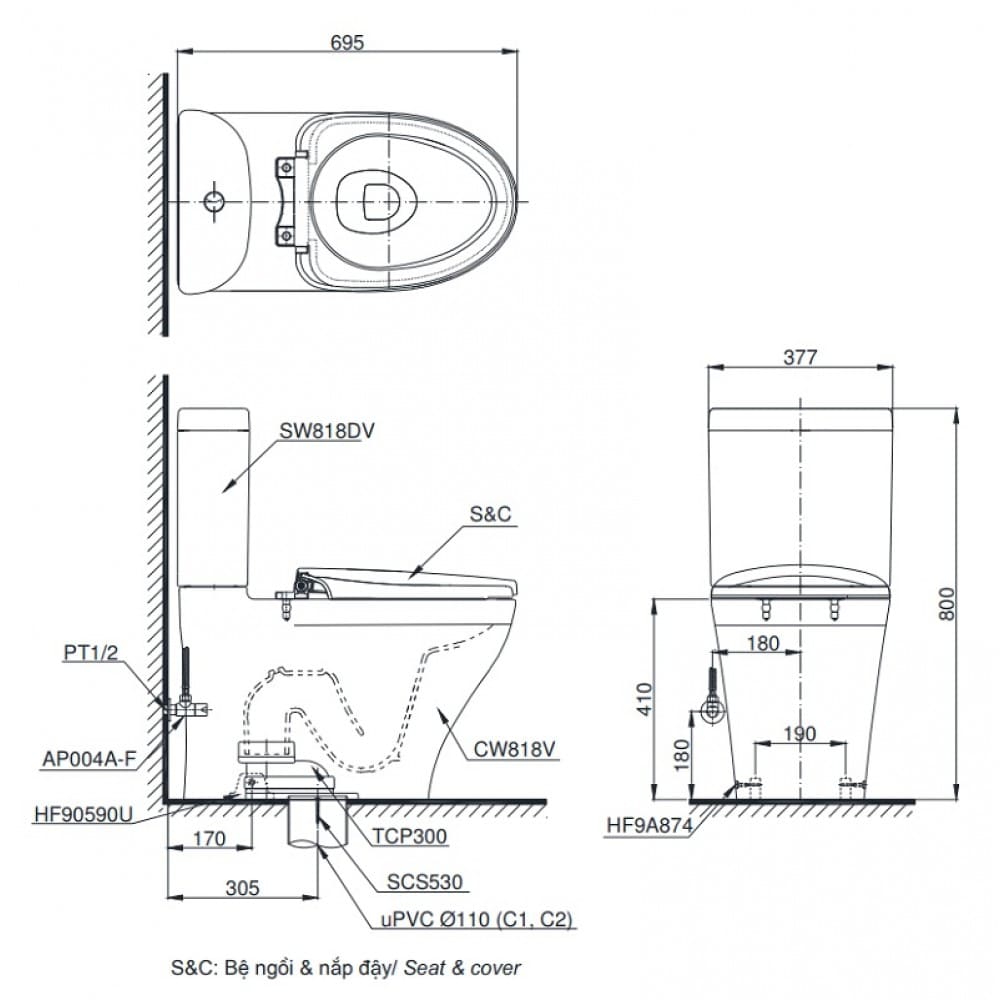 Hình ảnh: bản vẽ kỹ thuật Bồn Cầu Điện Tử TOTO CS818DW6 Nắp Rửa Washlet
