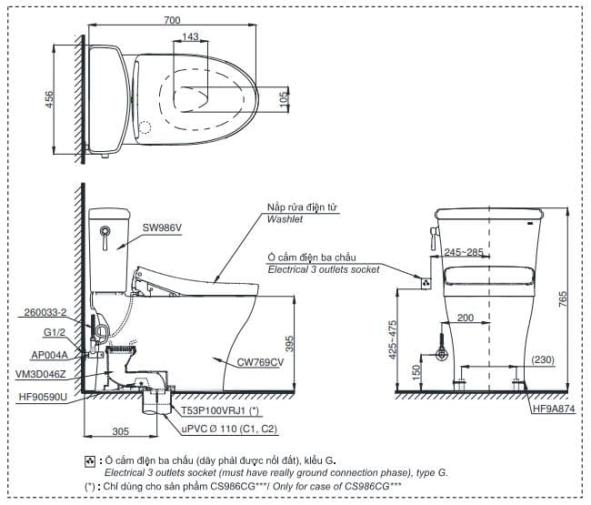 Bản vẽ kỹ thuật Bồn Cầu Điện Tử TOTO CS986GW11 Nắp Rửa Washlet:
