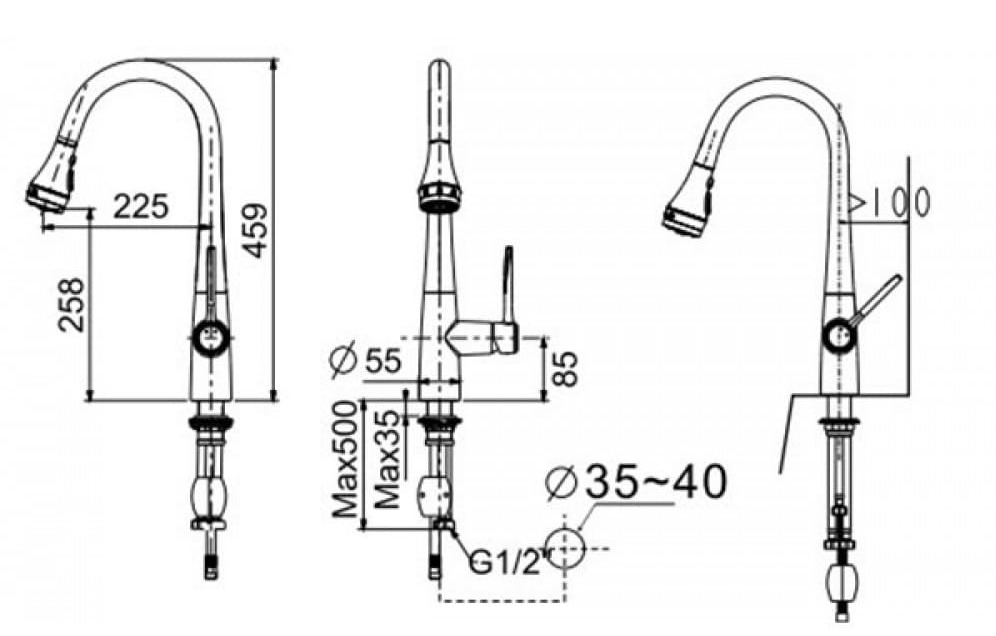 Hình ảnh: bản vẽ kỹ thuật Vòi bếp dây rút với đầu phun mưa American Standard WF-5634
