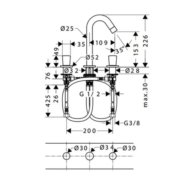 Hình ảnh: bản vẽ kỹ thuật Vòi chậu 3 lỗ Hansgrohe LOGIS 589.52.413