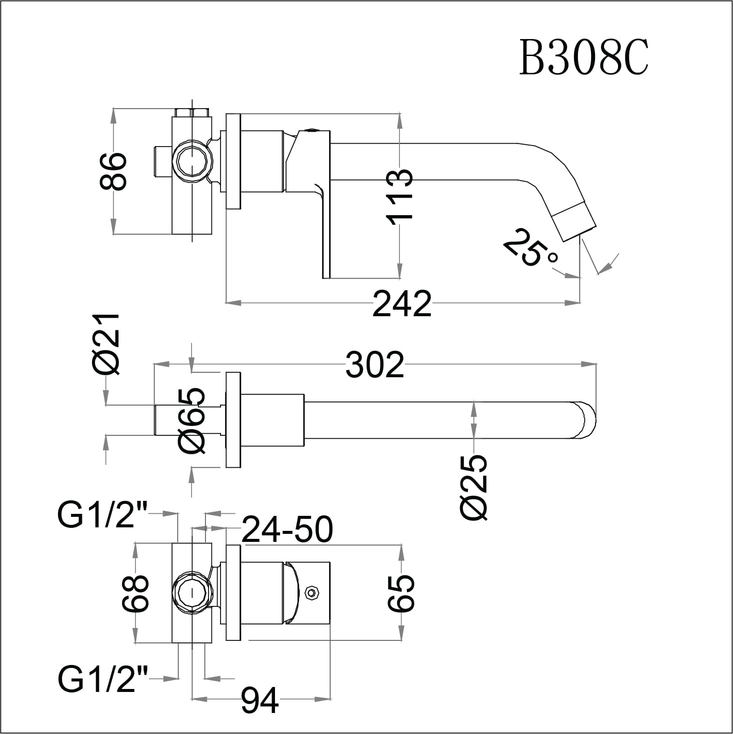 Bản vẽ kỹ thuật Vòi Nóng Lạnh Lavabo Gắn tường Caesar B308C: